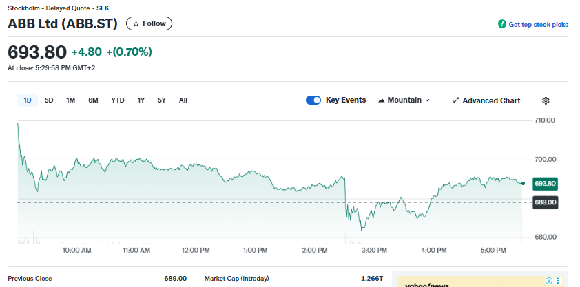 On the Stockholm exchange, ABB’s shares traded between SEK 681.20 and SEK 712.00 throughout the session, closing at SEK 693.80.