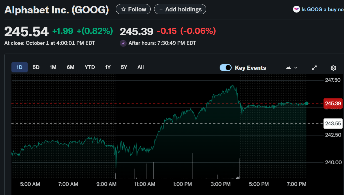 Alphabet Inc. shares climbed on Wednesday following a major AI-driven product revamp by Google. The stock closed higher by 0.82% at $245.54 before dipping slightly by 0.06% in after-hours trading.