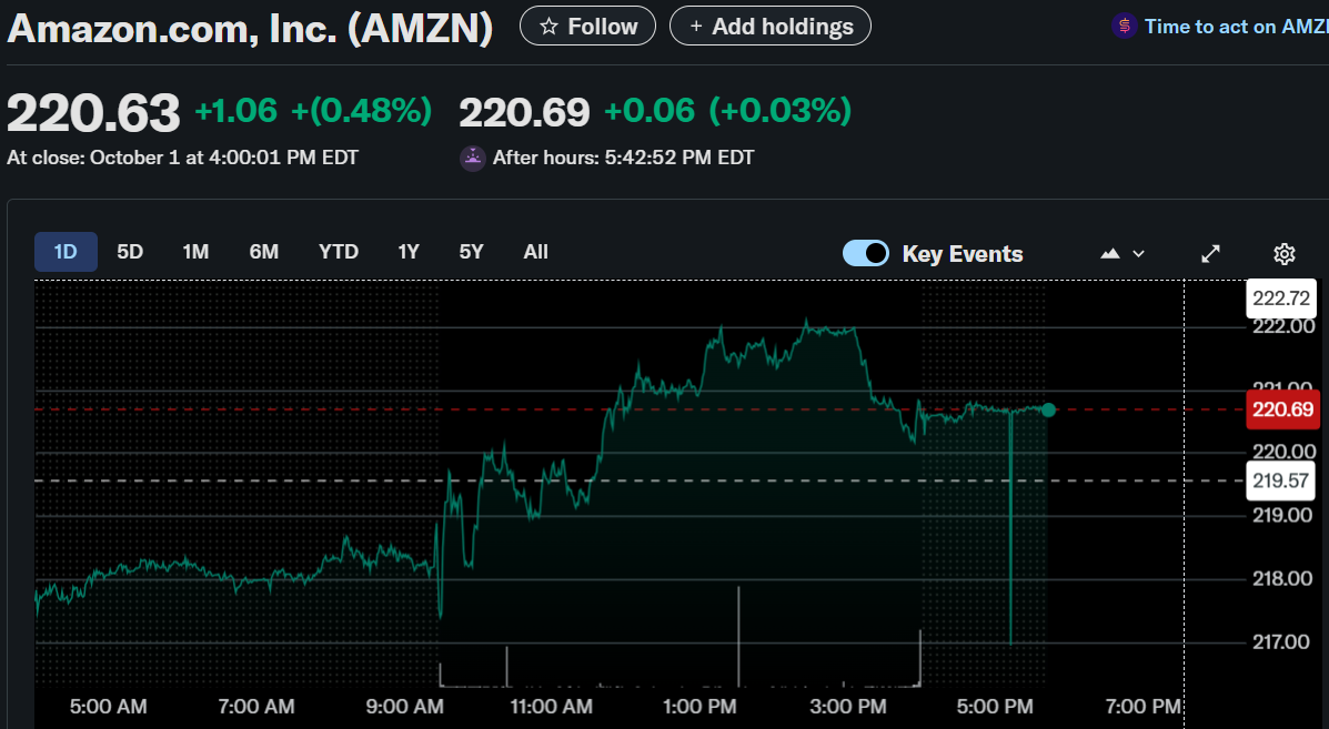 Amazon.com Inc. (NASDAQ: AMZN) ended regular trading at $220.63, marking a 0.48% rise. The stock gained slightly in after-hours trading, reaching $220.69.