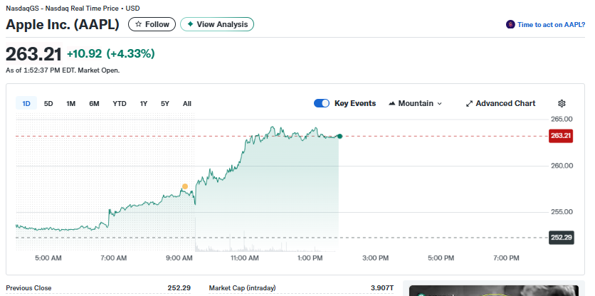 Apple’s share price reflected the positive sentiment, with AAPL trading higher on the NasdaqGS, gaining 4.26% to $263.12 as of 1:53 PM EDT.