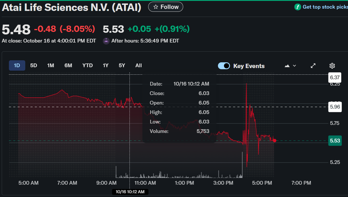 Atai Life Sciences N.V. (NASDAQ: ATAI) saw a sharp 8.05% intraday stock drop on October 16, closing at $5.48.The stock regained ground in after-hours trading, climbing 0.91% to $5.53.