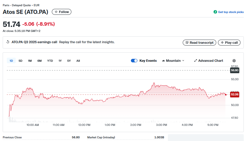 Atos SE (ATO.PA) closed at €51.74, down 5.06 points (-8.91%) as of 5:35 PM GMT+2, according to Paris market data.