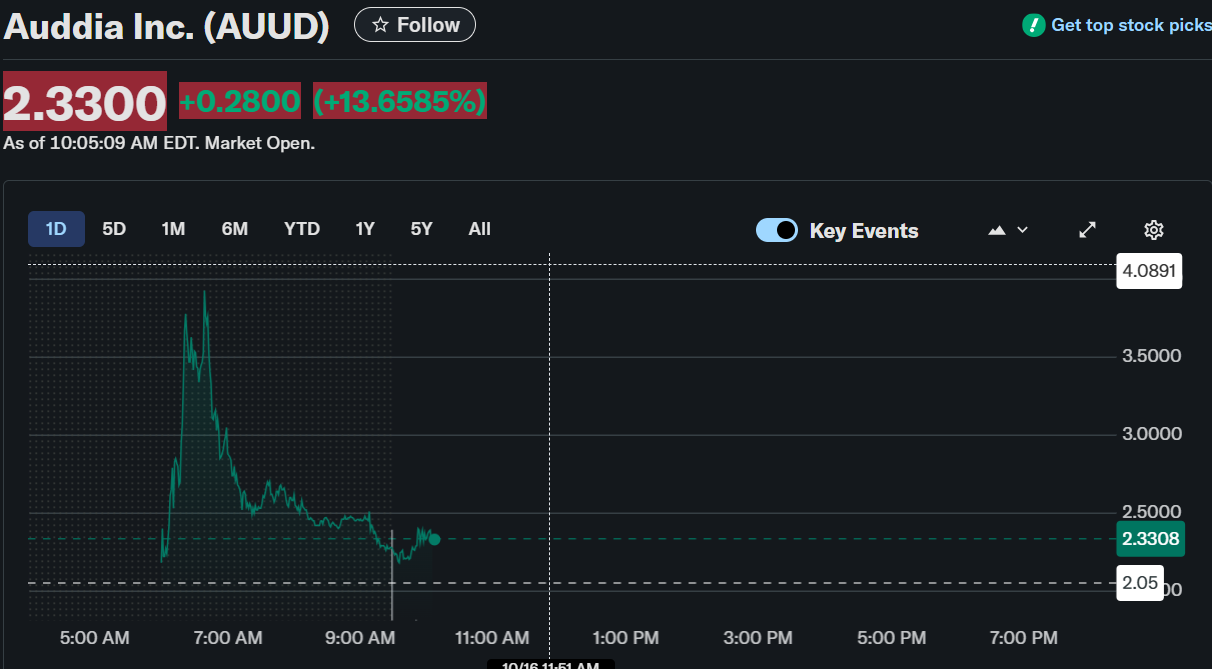 Auddia Inc. (AUUD) stock is trading at $2.33, up 13.66%, after experiencing a sharp spike to around $4.09 earlier in the day before pulling back and stabilizing.