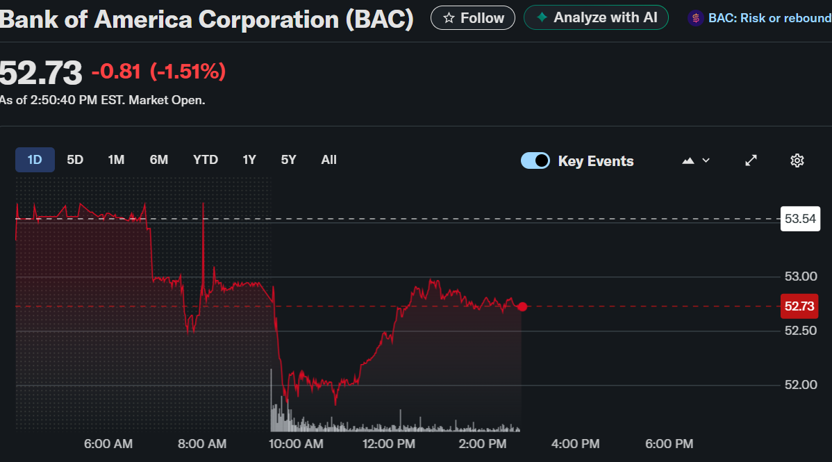 Bank of America (NYSE: BAC) stock dropped 1.8% to $52.76 during Wednesday’s session, following the company’s 2025 Investor Day.