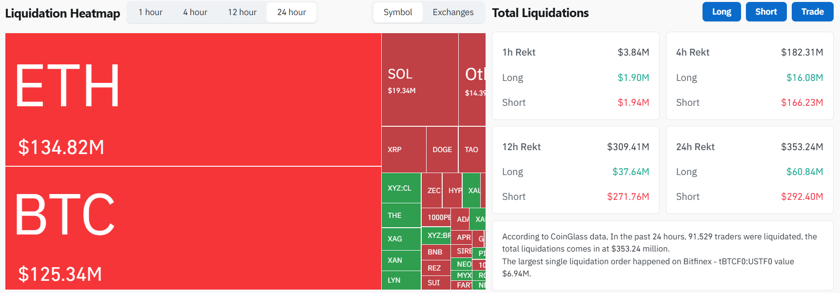 A significant portion of Monday’s price action stemmed from forced liquidations of bearish positions. According to CoinGlass analytics, $344 million in total liquidations occurred during the previous 24 hours, impacting 91,978 traders. Short positions represented $284.9 million—approximately 83%—of these liquidations. Ethereum shorts absorbed the heaviest losses at $127.9 million, with Bitcoin following at $124.5 million and Solana at $18.5 million. The single largest liquidation involved a $6.94 million Bitcoin position on the Bitfinex exchange.