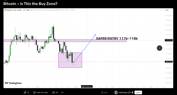 Bitcoin is currently trading around $111,749 after pulling back from its mid-August high above $124,000. This roughly 10% correction has brought the token back to a key support zone between $108,000 and $109,000. Historically, September tends to be a weaker month for BTC, but past cycles have shown that a soft September often sets the stage for a strong Q4 recovery.