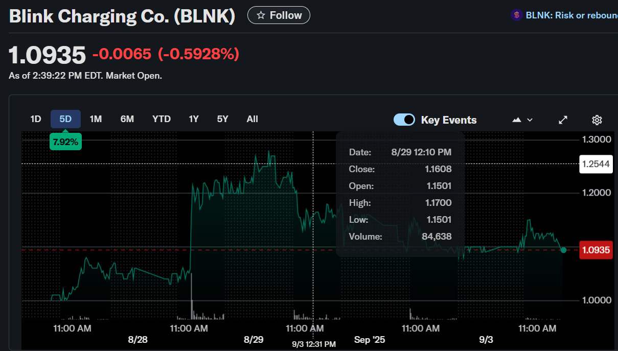- Blink Charging stock trades at $1.1250, up 2.27% as of September 2, 2025.