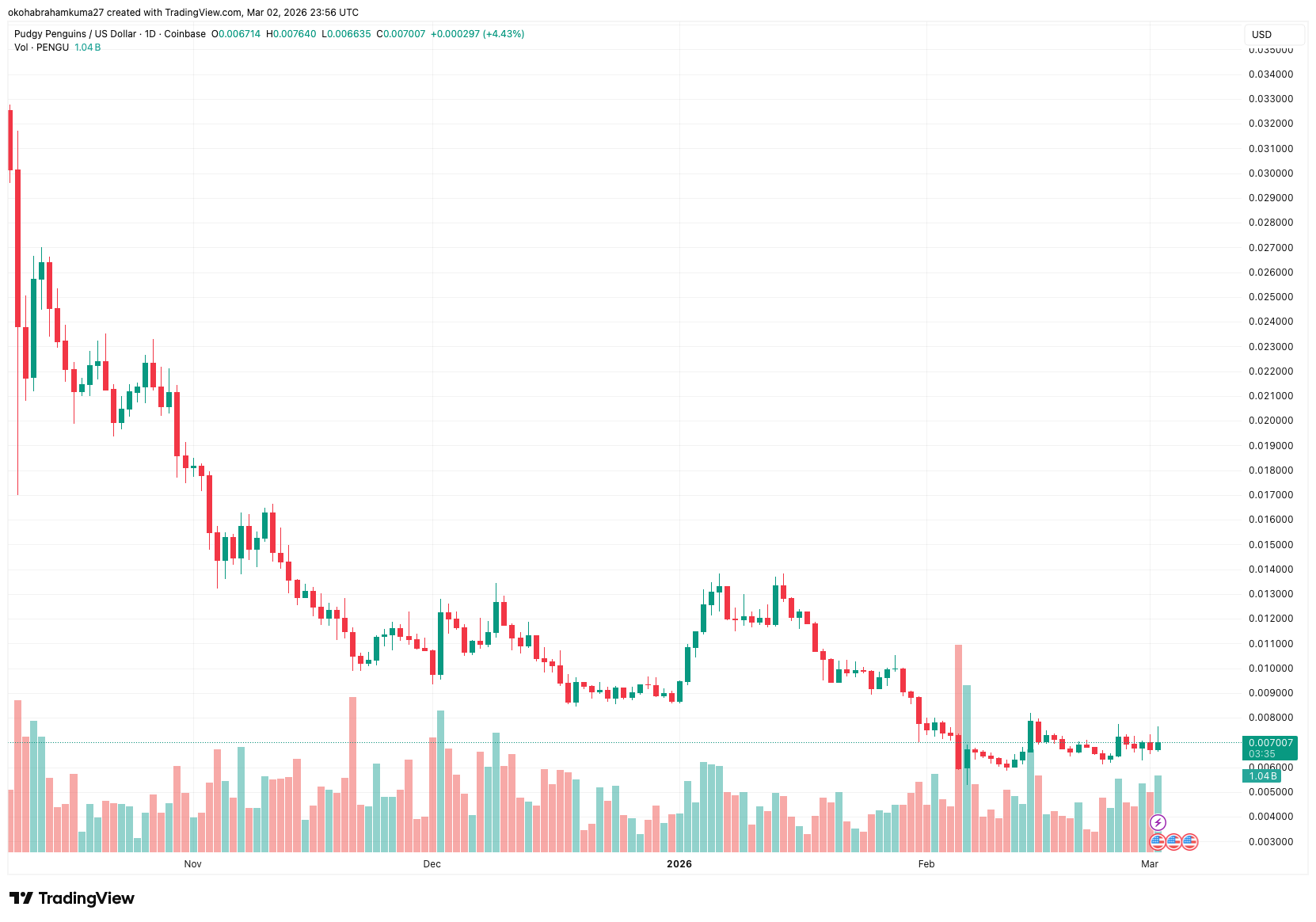The Pudgy Penguins ecosystem is also failing to get the momentum required for massive financial growth. Currently priced at $0.007397 as of March 2nd, the token is heavily bogged down by bearish sentiment and an extreme fear index rating.