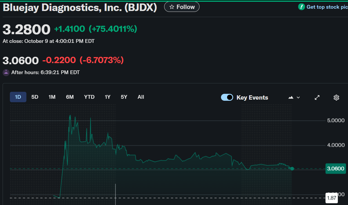 Bluejay Diagnostics, Inc. (BJDX) shares experienced a dramatic surge on October 9, closing at $3.28, a 75.40% increase. The spike followed news of a $4.5 million private placement, drawing strong attention during regular trading hours. However, after-hours trading showed a modest pullback, with the stock edging down 2.74% to $3.19.
