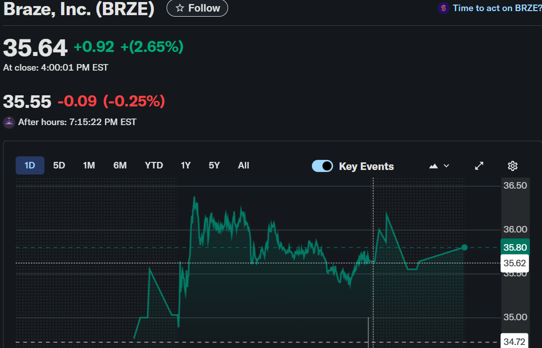 Braze, Inc. (BRZE) has seen impressive stock price growth recently. As of 12:55 PM, the stock reached $35.83, marking a 2.88% increase from the previous day’s close.
