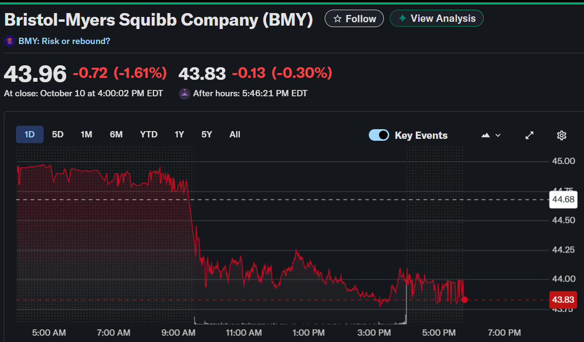 Bristol-Myers Squibb shares experienced a sharp decline throughout October 10, closing at $43.96, down 1.61% for the day. The drop extended slightly in after-hours trading, slipping another 0.30% to $43.83, reflecting a cautious market response.