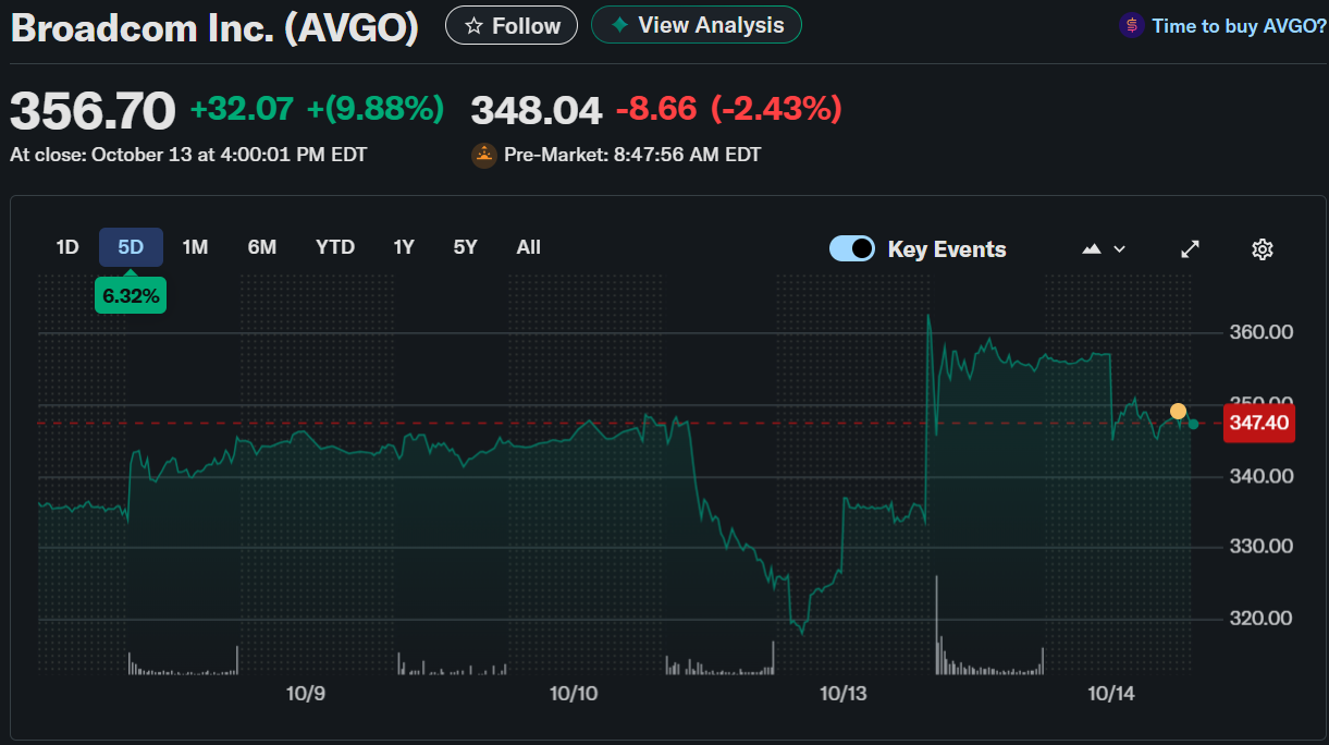 AVGO advanced strongly after unveiling the world’s first Wi-Fi 8 silicon solutions designed for the AI edge. The stock closed at $356.70 with a 9.88% gain, signaling bullish momentum despite a slight pre-market dip. The announcement positioned Broadcom as a leader in next-generation wireless innovation tailored for AI-driven connectivity.