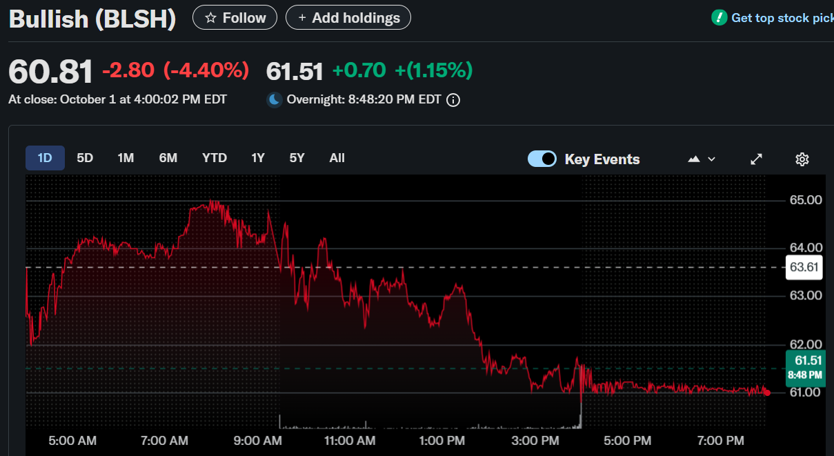 Bullish (BLSH) saw a rebound in after-hours trading, gaining 1.45% to close at $61.69 after a 4.40% decline. The drop earlier in the day followed a peak in morning trading, but optimism returned following major U.S. expansion news. The stock’s movement reflects rising attention toward Bullish’s growth in the crypto trading space.