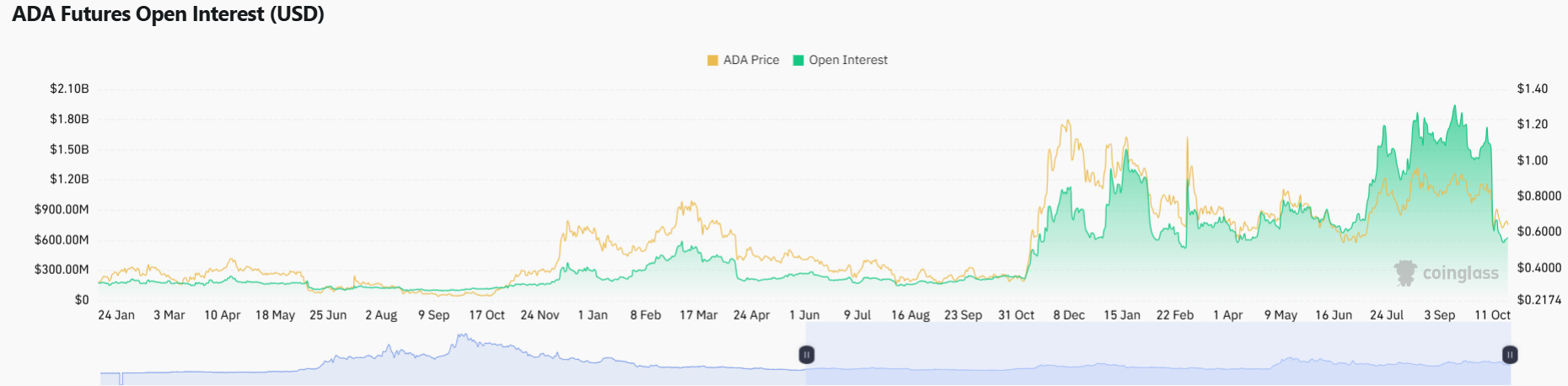 Futures open interest for Cardano stands at $648.56 million based on Coinglass data. This marks a sharp drop from over $1.8 billion in mid-September. The decline followed ADA’s move below $0.70.