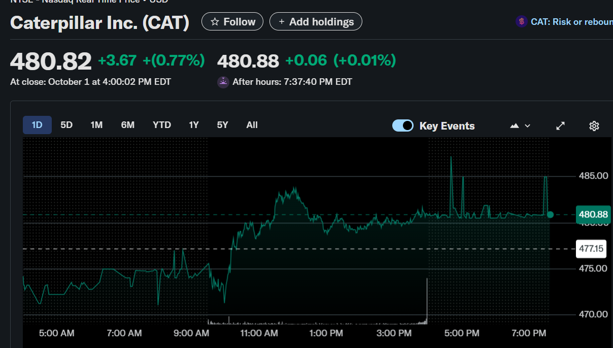 Caterpillar Inc. ($CAT) closed at $480.82 gaining 1.17% during regular trading.