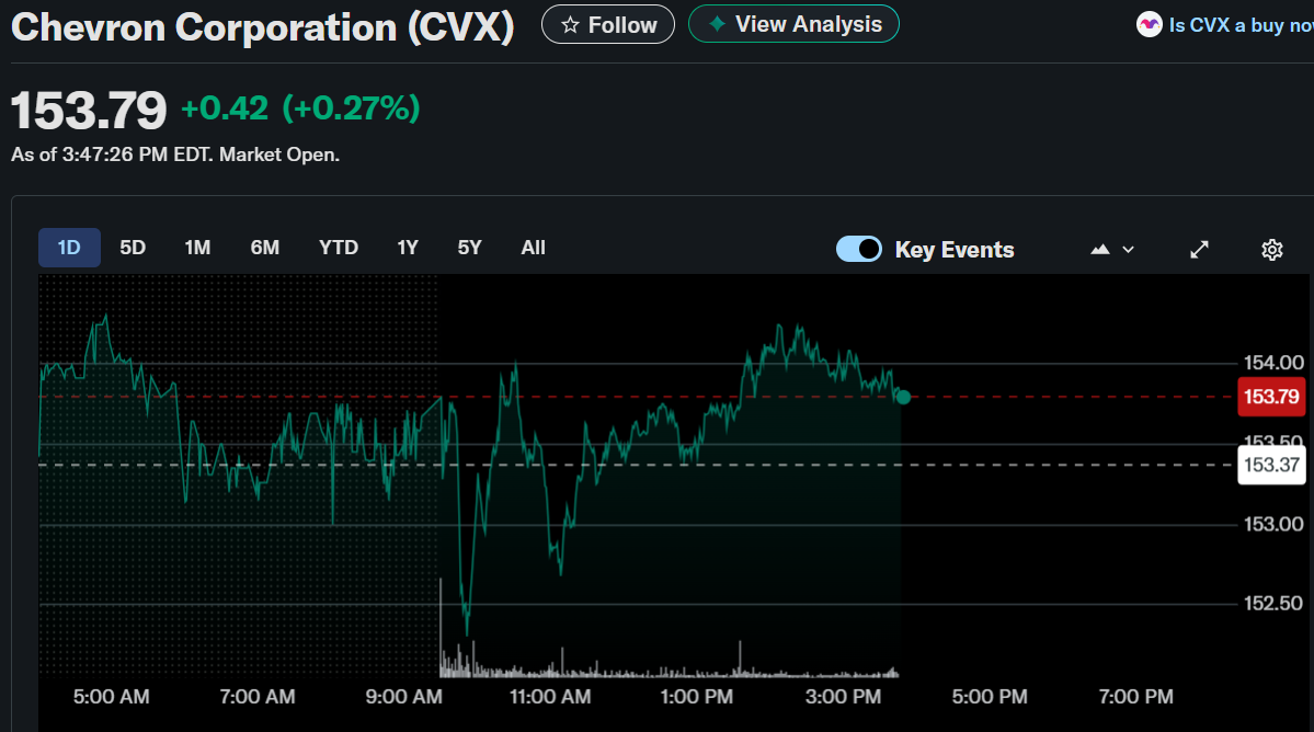 Chevron Corporation(CVX) stock edged up 0.27% by mid-afternoon, reaching $153.79 amid reports of a strategic asset sale.