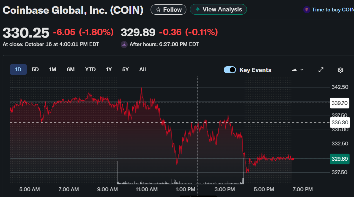 Coinbase Global (COIN) closed at $330.25 on October 16, down 1.80%, before slipping further to $329.89 in after-hours trading.