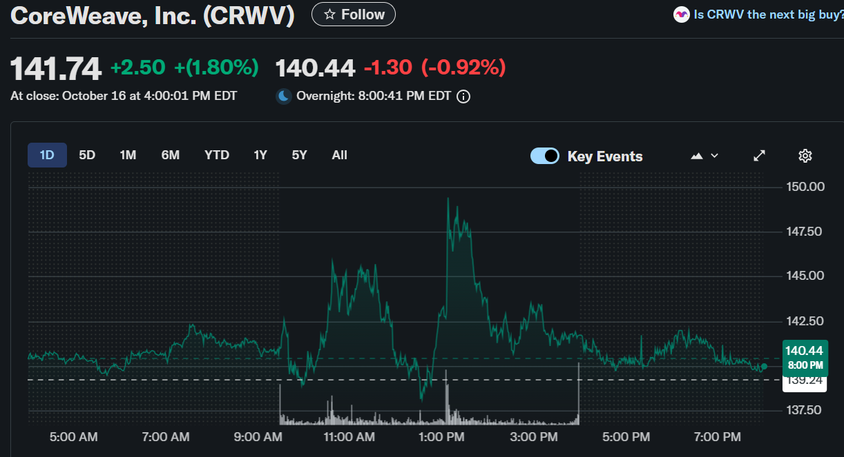CoreWeave, Inc. (NASDAQ: CRWV) ended regular trading at $141.74, gaining 1.80% before dipping 0.92% to $140.44 after hours.