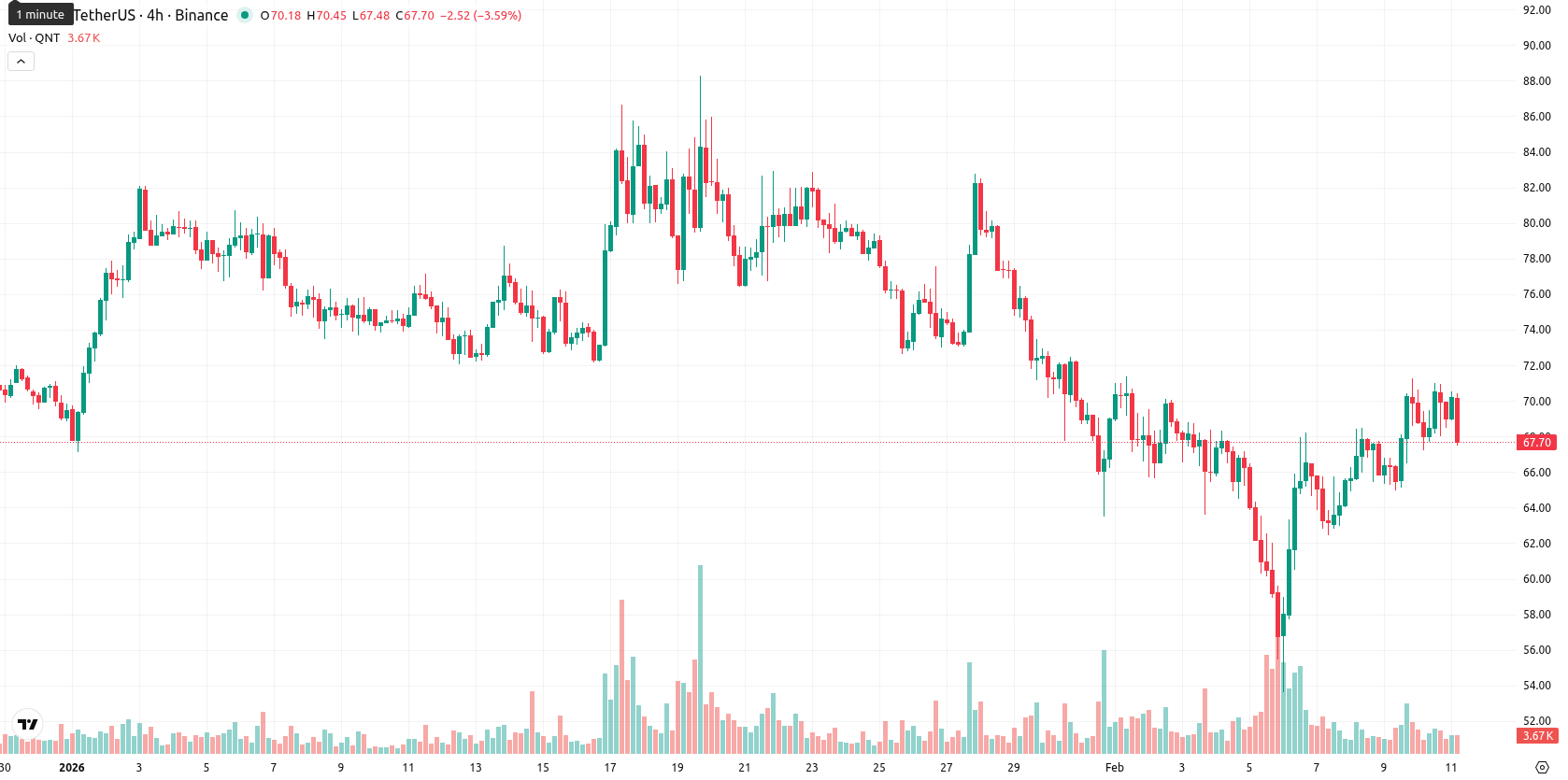 Breaking crypto headlines show QNT beneath the 20-day, 50-day, and 200-day moving averages at $71.07, $73.95, and $89.36, respectively.