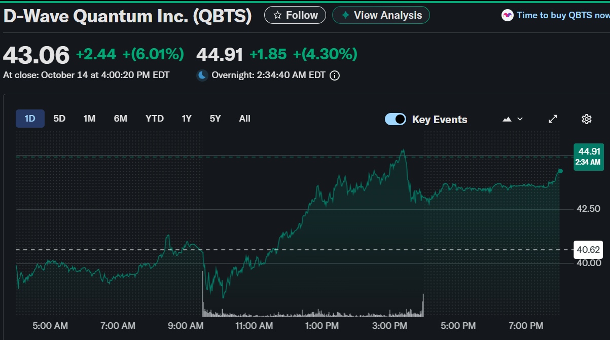 D-Wave Quantum Inc. (NYSE: QBTS) ended the trading day at $43.06, posting a solid 6.01% rise. The momentum continued in after-hours trading as the stock climbed further to $44.91, marking a 4.30% gain.