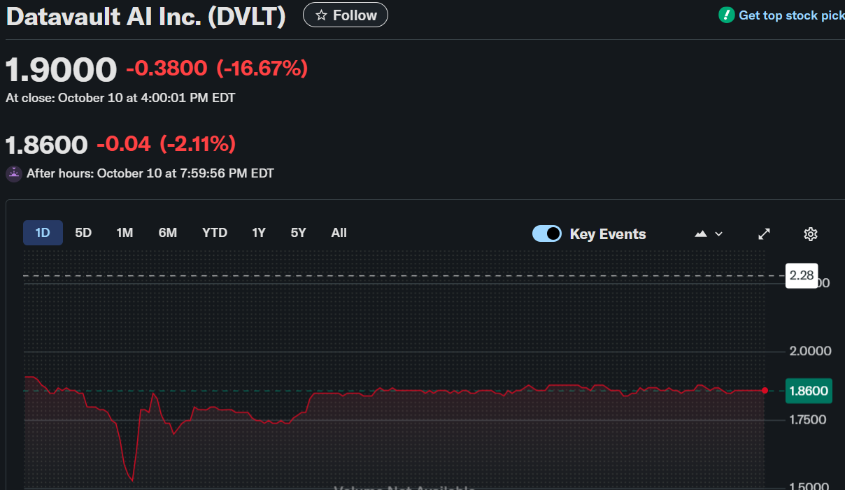 DVLT fell significantly 16.7% during regular trading and finished at $1.90 on heavy volume. After hours, the stock hovered near $1.86, underscoring damp sentiment and continued supply pressure. Intraday action showed a morning fade, a failed bounce near $2, and a grinding decline throughout.