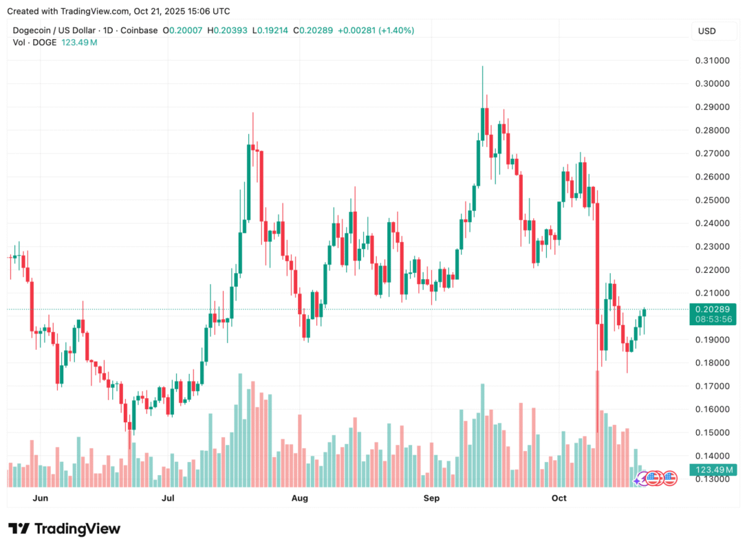 Dogecoin (DOGE) trades near $0.2028 after a quick 2.5% pop. A new post on X from Elon Musk flashed the Shiba Inu mascot, and DOGE spiked 29% intraday. The jump extends a 55% two-week rebound off the $0.13 low, DOGE’s weakest level since April.