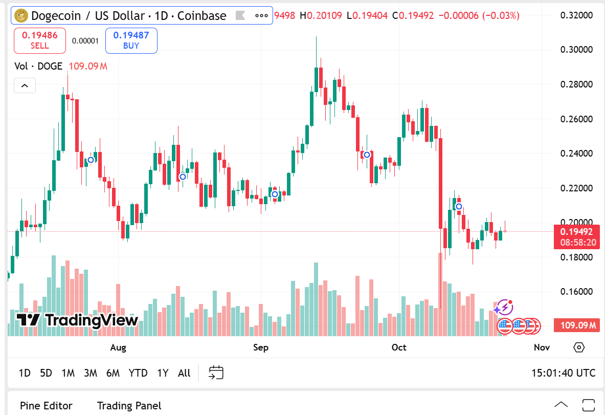 Dogecoin is selling at $0.1948, a significant 1.4% gain in the past 24 hours with a market cap of $29.61 billion. The 24-hour trading volume is $1.69 billion, a decrease of 24.87%, as consolidation occurs following recent volatility. The reduction of short-term volume could mean traders are holding off until a clear breakout is established before re-establishing positions.