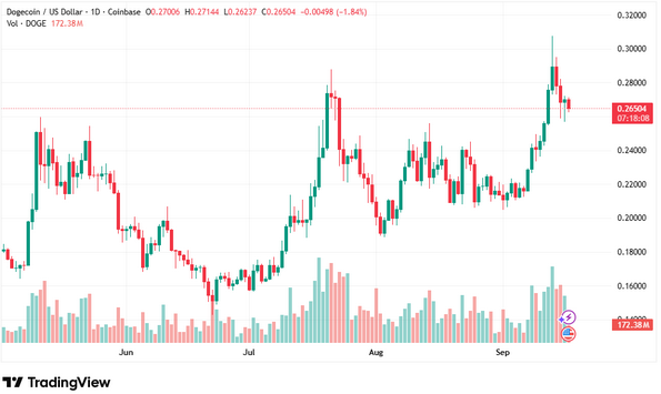 Dogecoin is up from recent lows as ETF chatter and broader risk appetite returned to markets. Price action shows DOGE testing resistance near $0.30, with support clustered around $0.24–$0.26. A break above $0.30 would invite fresh momentum.