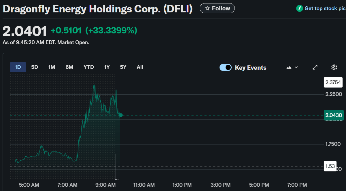 DFLI gained strong attention after its shares surged over 36% in pre-market trading. The DFLI stock closed at $1.53, down 2.55%, but rebounded sharply to $2.09 ahead of market open. This sudden rise reflected heightened confidence in Dragonfly Energy’s technological progress and its latest patent milestone.