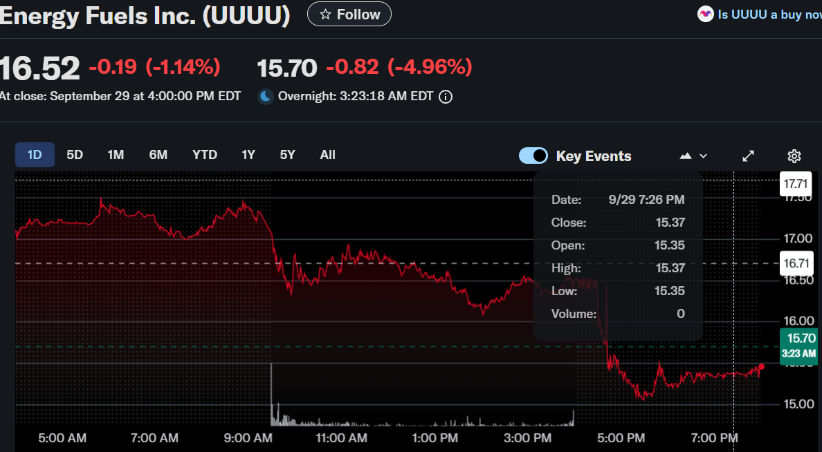 Energy Fuels Inc. shares declined significantly following a major financing announcement late Monday. The stock closed regular trading at $16.52, falling 1.14%, and then dropped further to $15.65 after hours, down another 5.27%.