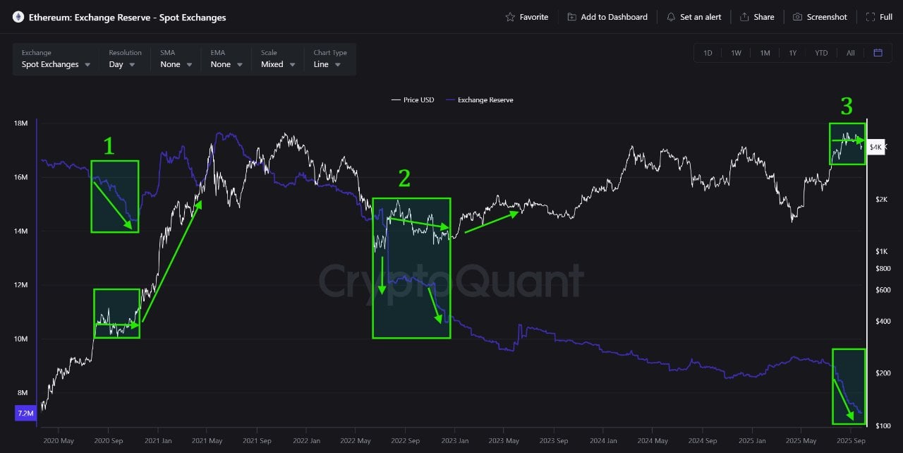 Fresh data from CryptoQuant highlights a third historic phase of exchange outflows for Ethereum. In previous cycles, similar supply drains have directly preceded dramatic rallies.