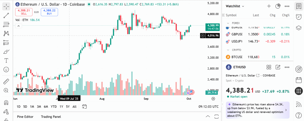 Ethereum has recently broken above the $4,388 mark, with ETF inflows and institutional accumulation pushing optimism. Standard Chartered raised ETH’s year-end price prediction to $7,500, citing adoption and enterprise demand.