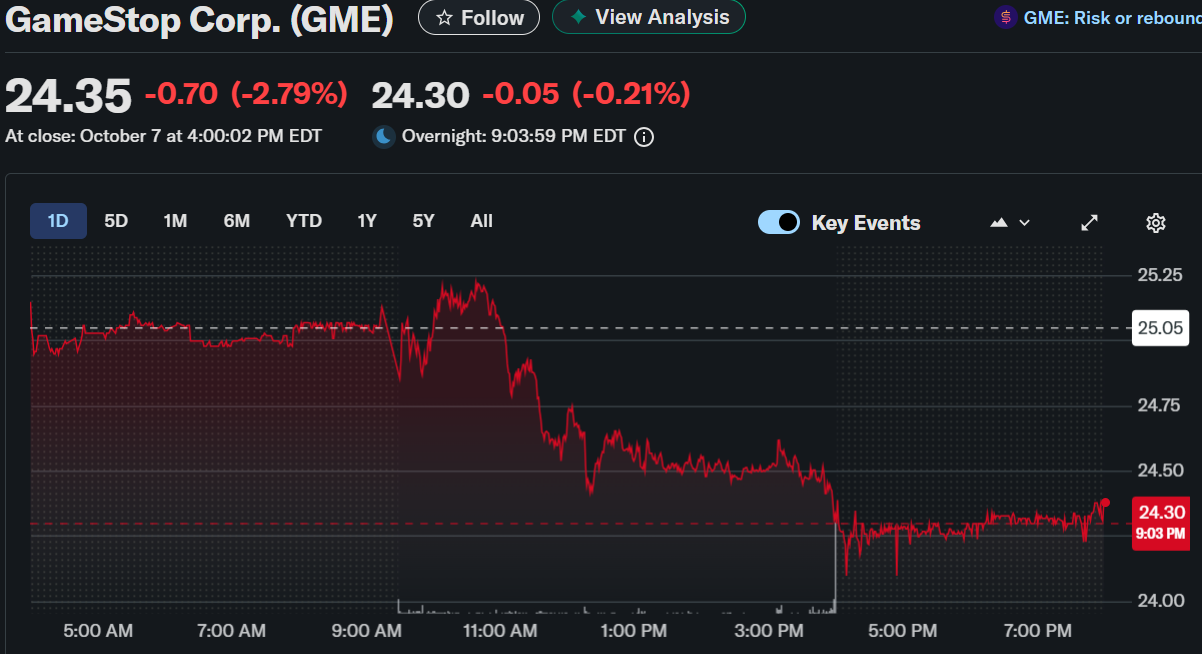 GameStop Corp. (NYSE: GME) saw its stock decline by 2.79% on October 7, closing at $24.35. The price continued to slide slightly after-hours, reaching $24.30 by 9:03 PM EDT. This movement coincided with the official rollout of the company’s shareholder warrant dividend.