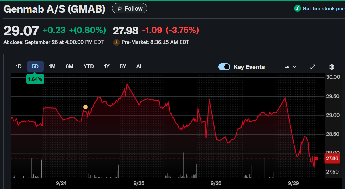 GMAB stock closed at $29.07, up 0.80% on September 26, but pre-market trading showed a decline to $28.27. The dip reflects short-term bearish sentiment despite the strategic potential of the deal. Market participants are evaluating the financial and operational impact on both companies.