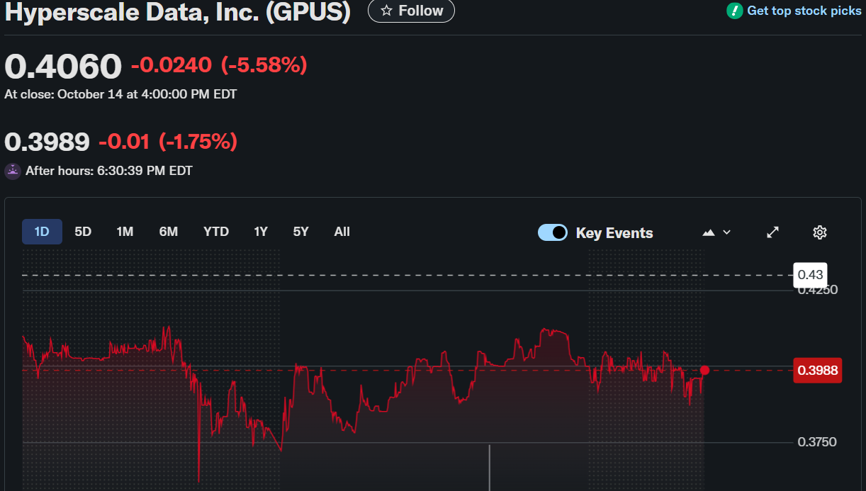 Hyperscale Data, Inc. (GPUS) saw its stock decline by 5.58% during regular hours, closing at $0.4060. After-hours trading added further pressure, dropping the price another 1.75% to $0.3989. This sharp movement occurred despite the company revealing a substantial Bitcoin treasury strategy.