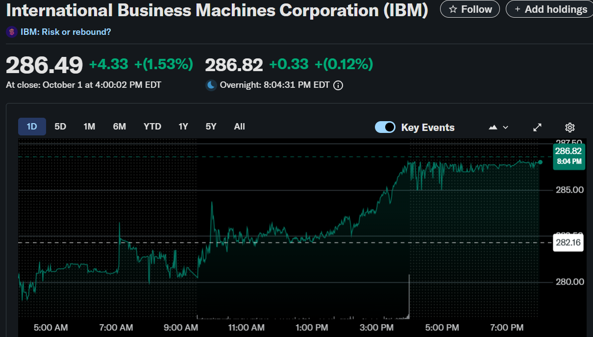 IBM stock advanced strongly on October 1, closing at $286.49 and adding a further after-hours rise to $286.82.