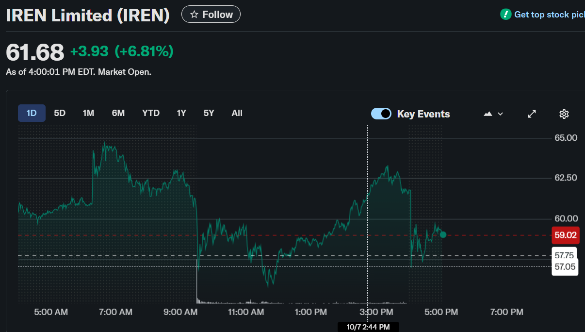 IREN Limited saw a notable 6.76% jump in its stock price, closing at $61.66 after a volatile trading session.