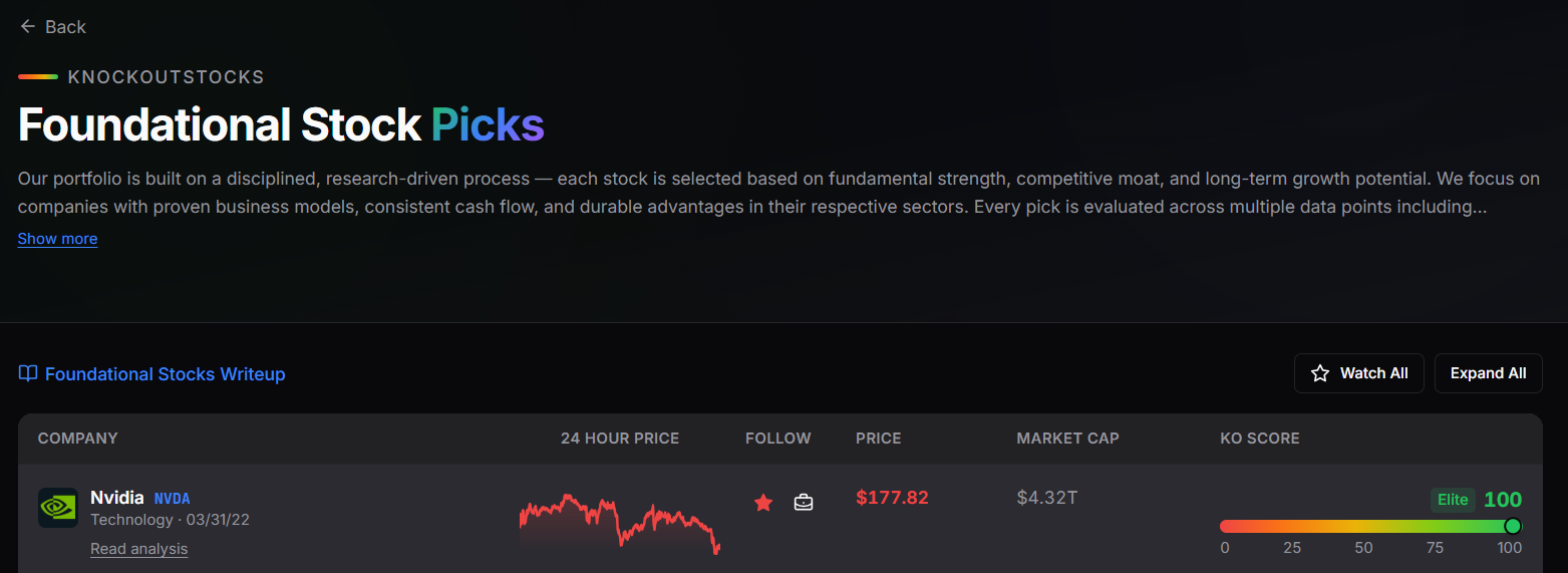 Benzinga does not maintain a curated stock recommendations portfolio with similar structure. The platform publishes stock-focused content, analyst rating updates, and market analysis, but lacks a dedicated high-conviction portfolio constructed and monitored by an internal research division. Investors seeking a structured, researched collection of stock recommendations will find KnockoutStocks more suitable for this purpose.