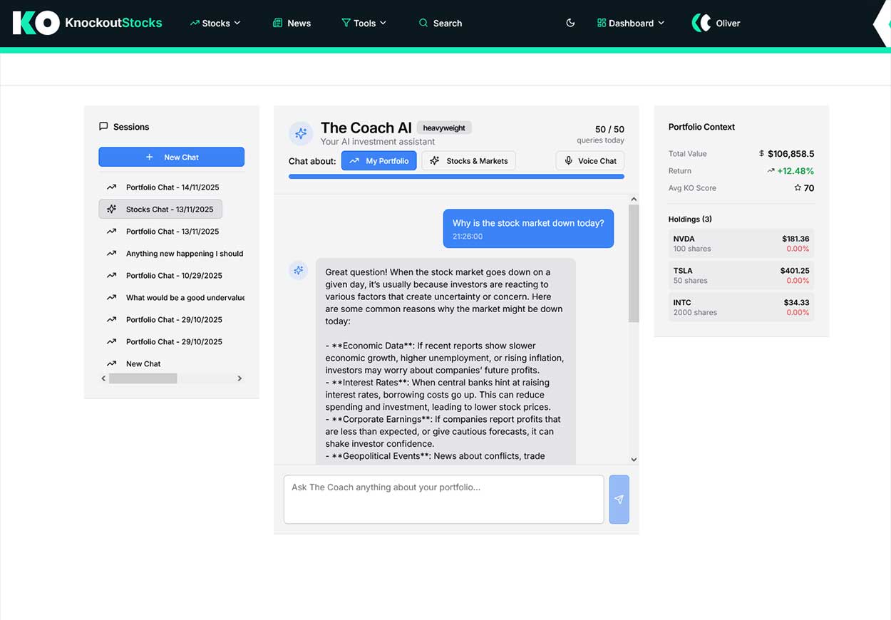 KnockoutStocks integrates artificial intelligence as its foundational architecture. The AI advisor accepts natural language questions about specific securities, portfolio composition, or broader market dynamics. Premium subscription levels unlock voice interaction and unrestricted query volume.