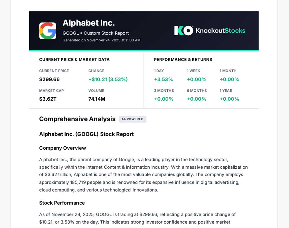 KnockoutStocks produces comprehensive AI-driven equity reports instantly upon request. These reports encompass company profiles, financial condition analysis, critical performance indicators, market behavior patterns, breaking developments, and analyst perspectives — consolidated into a single document.
