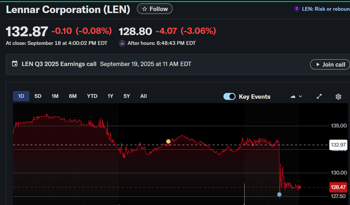 Lennar Corporation(LEN) shares closed at $132.87 but fell over 3% in after-hours trading, landing at $128.80. The decline followed the release of Q3 2025 results that showed a 46% year-over-year drop in earnings. Lennar attributed the fall to margin pressure and increased incentives to drive demand.