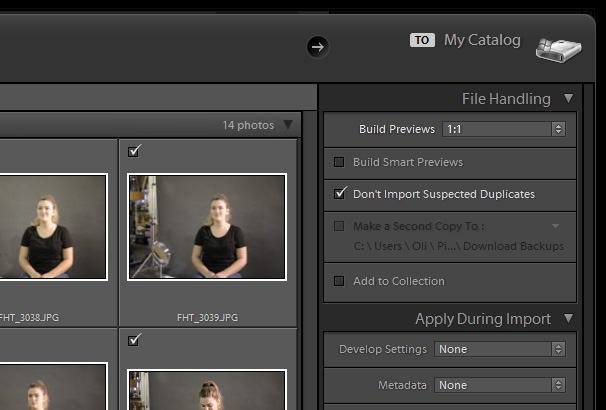 - File Handling – For a beginner, a 1:1 preview is best desired. It is not only quicker for Lightroom to import your files while in this mode but also minimizes the potential loss of clarity and sharpness during the process. Speaking of time, you can significantly reduce the chances of importing duplicate images ( in case you have some in your source folder ) by checking the ‘Don’t Import Suspected Duplicates’ box. At this stage, you can also specify the destination of the ‘backup location’ if you’re getting your files from a flash drive or memory card.