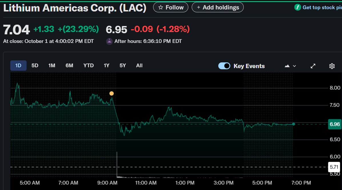 Lithium Americas Corp. experienced a sharp stock rise of 23.29%, closing Wednesday at $7.04. This spike followed news that the U.S. Department of Energy acquired a 5% stake in the company and its Thacker Pass lithium joint venture. The after-hours session saw a minor dip, with shares settling at $6.95.