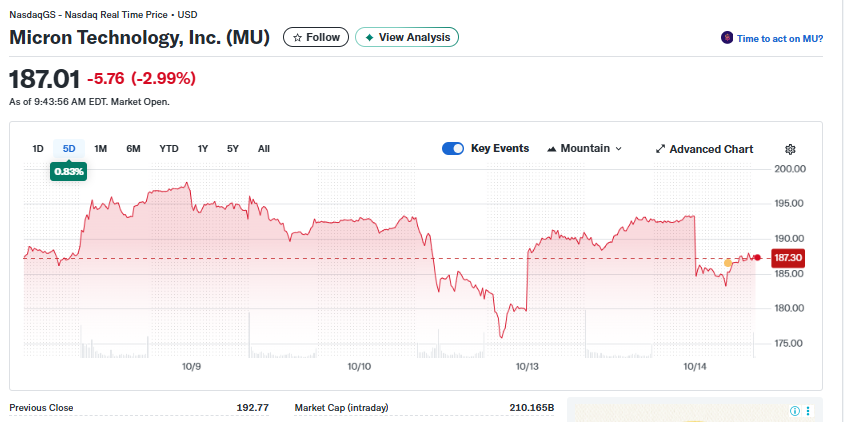Micron Technology (NASDAQ: MU) opened lower on Tuesday, trading at $186.87, down $5.90 or 3.06% in early Nasdaq trading.