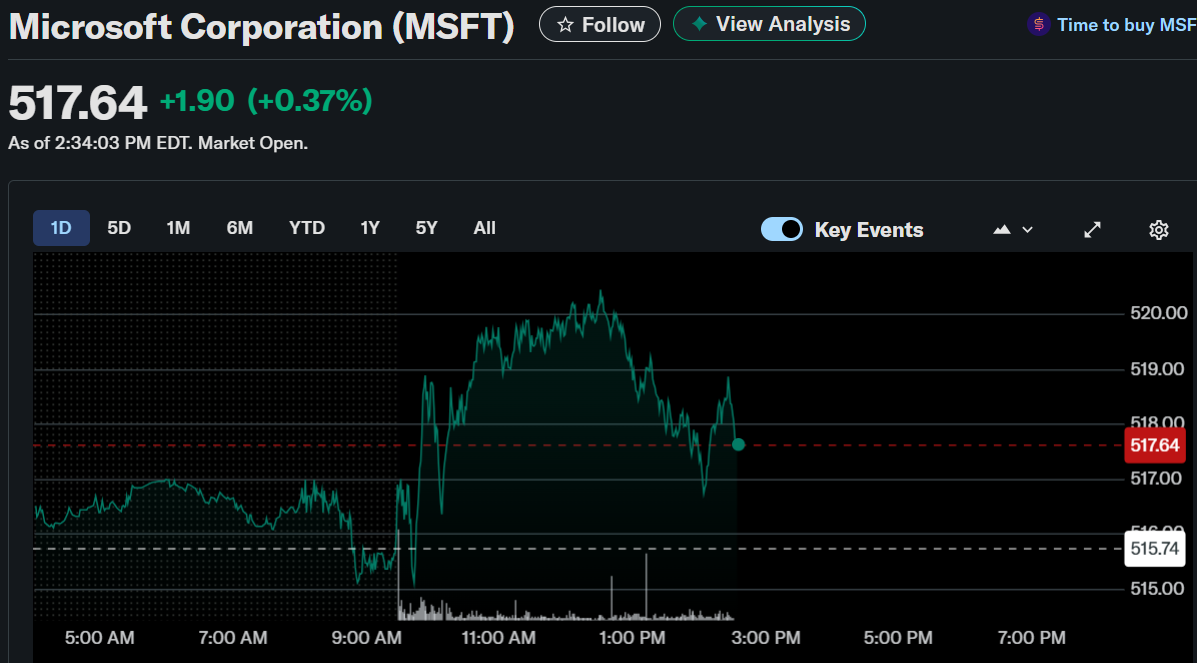 Microsoft stock rose 0.37% to $517.64, maintaining a steady upward movement throughout the trading session. The price action included a sharp morning decline, followed by a midday peak above $519 before easing slightly.