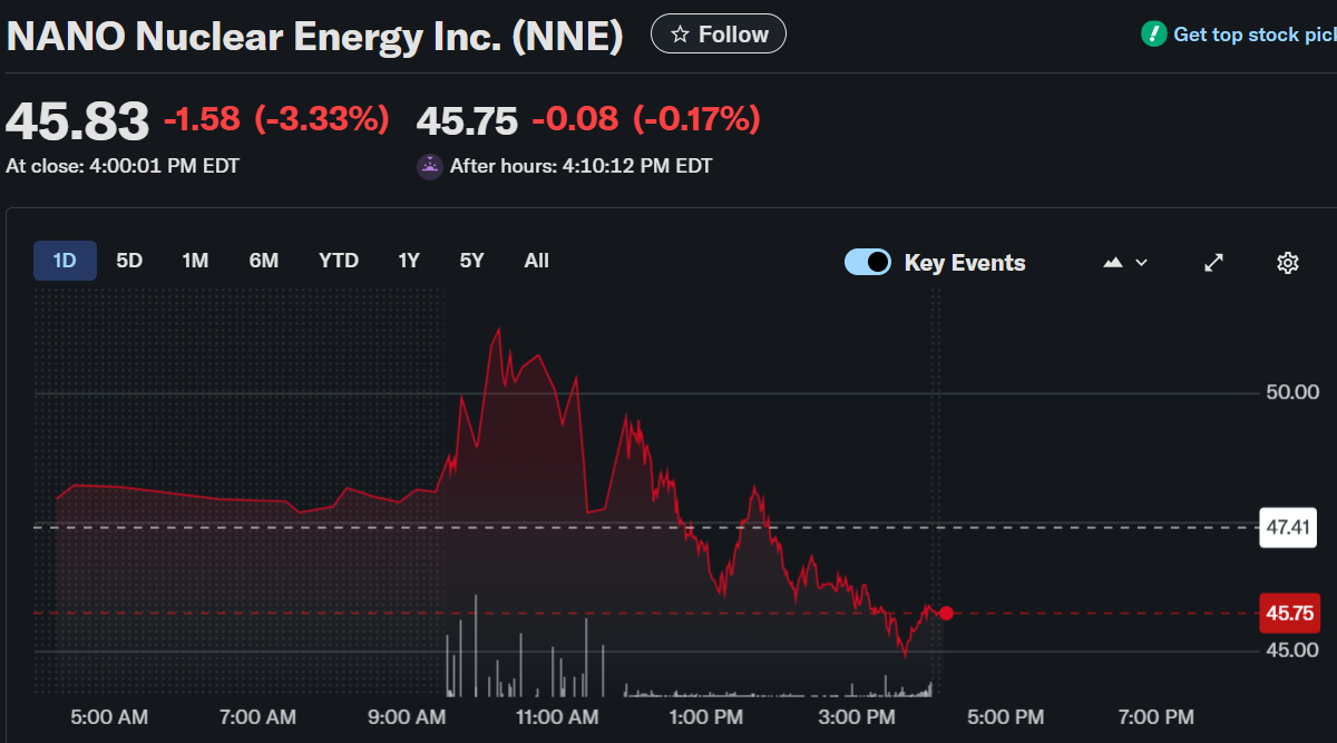 NANO Nuclear Energy Inc. stock (NASDAQ: NNE) experienced a volatile trading session, dropping 3.33% to close at $45.83. The stock initially surged before 11 AM but gradually declined throughout the afternoon and extended losses slightly in after-hours trading.