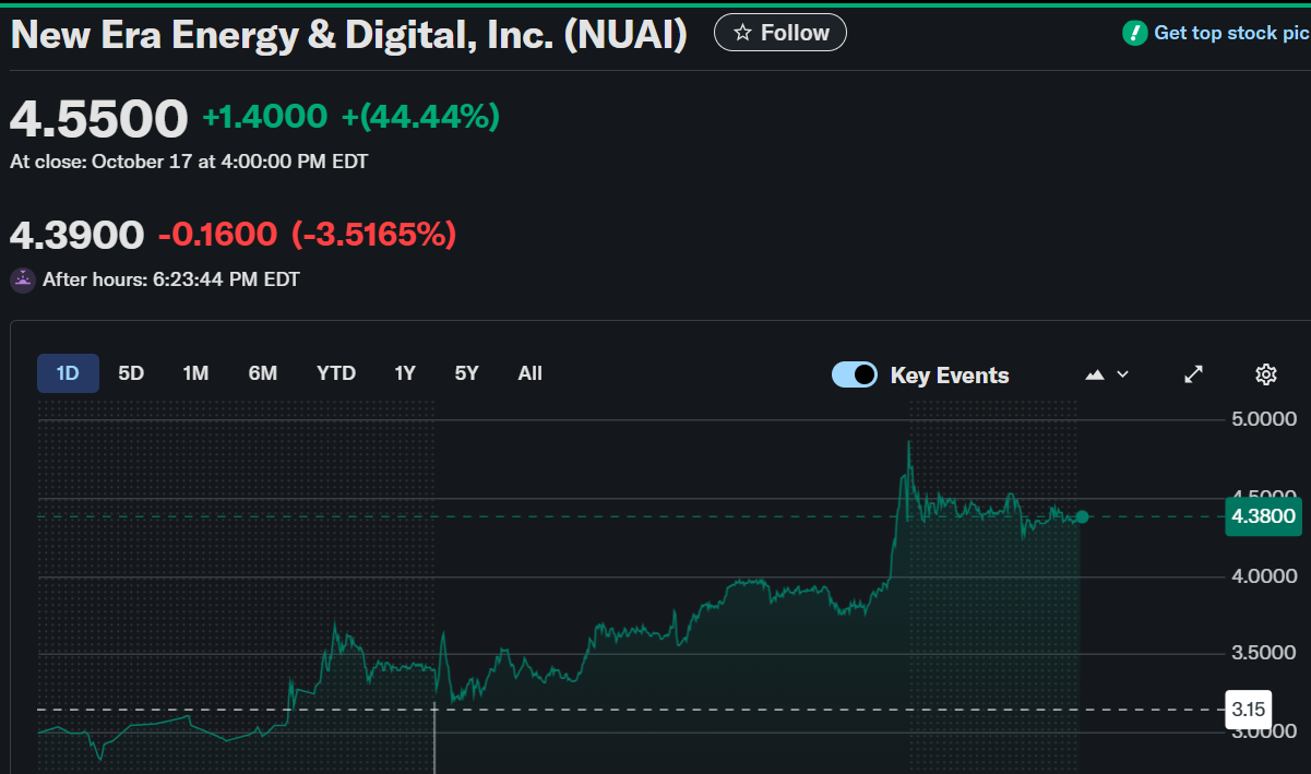 Shares of New Era Energy & Digital, Inc. surged 44.44% on October 17, closing at $4.55 per share.