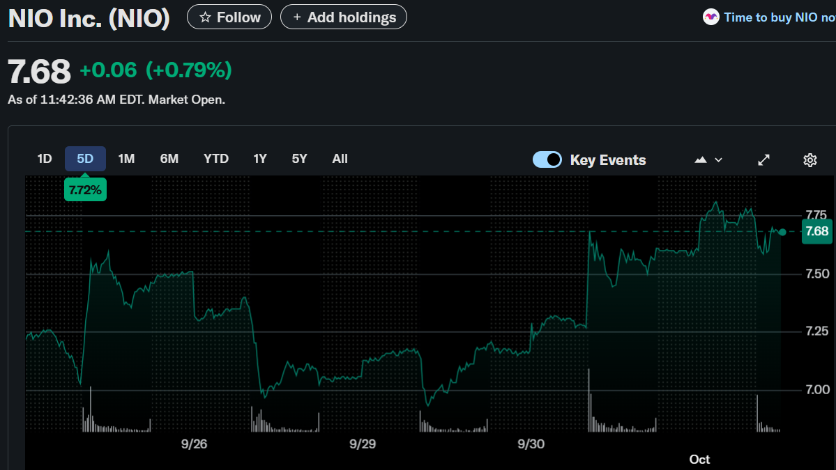 NIO stock rallied after the company reported record September and third-quarter 2025 deliveries. The automaker delivered 34,749 vehicles in September, marking a 64.1% year-over-year increase. Shares closed at $7.62, up 5.69%, and advanced further in pre-market trading at $7.78, up 2.23%.