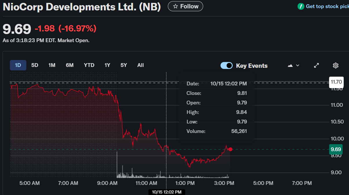 NioCorp Developments Ltd. (NASDAQ:NB) witnessed a steep intraday drop of nearly 17%, falling from $11.70 to $9.69.