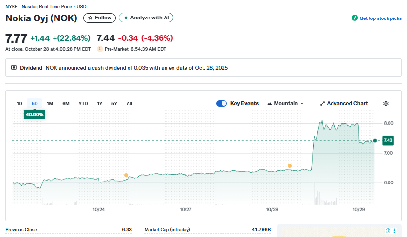 Nokia Oyj (NYSE: NOK) surged nearly 23% on Monday, closing at $7.77, after Nvidia announced a $1 billion investment for a 2.9% stake in the Finnish telecom giant.